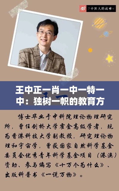 “王中正一肖一中一特一中:独树一帜的教育方法揭秘”是一篇针对王中正教授独特的教育方法进行深入研究的文献。该文献通过分析王中正教授多年来的教育实践,提取其教育理念的核心要素,并通过具体的教学案例,揭示其教学方法的独特性、创新性及其在教育领域的应用价值。本文将详细介绍文献中所提供的教育方法的详细内容,以供同行和教育工作者参考和学习。